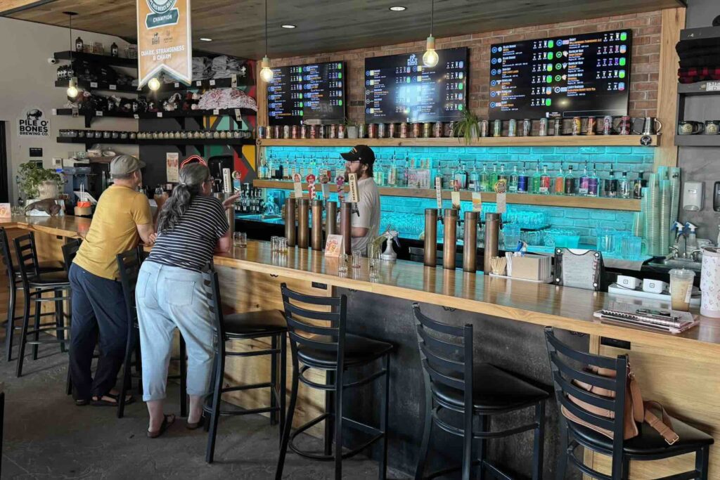 We head to a Pile O’ Bones Brewing Company. While locals instantly recognize the name and plains bison logo, tourists like me often raise an eyebrow. “We’re eating… where?”